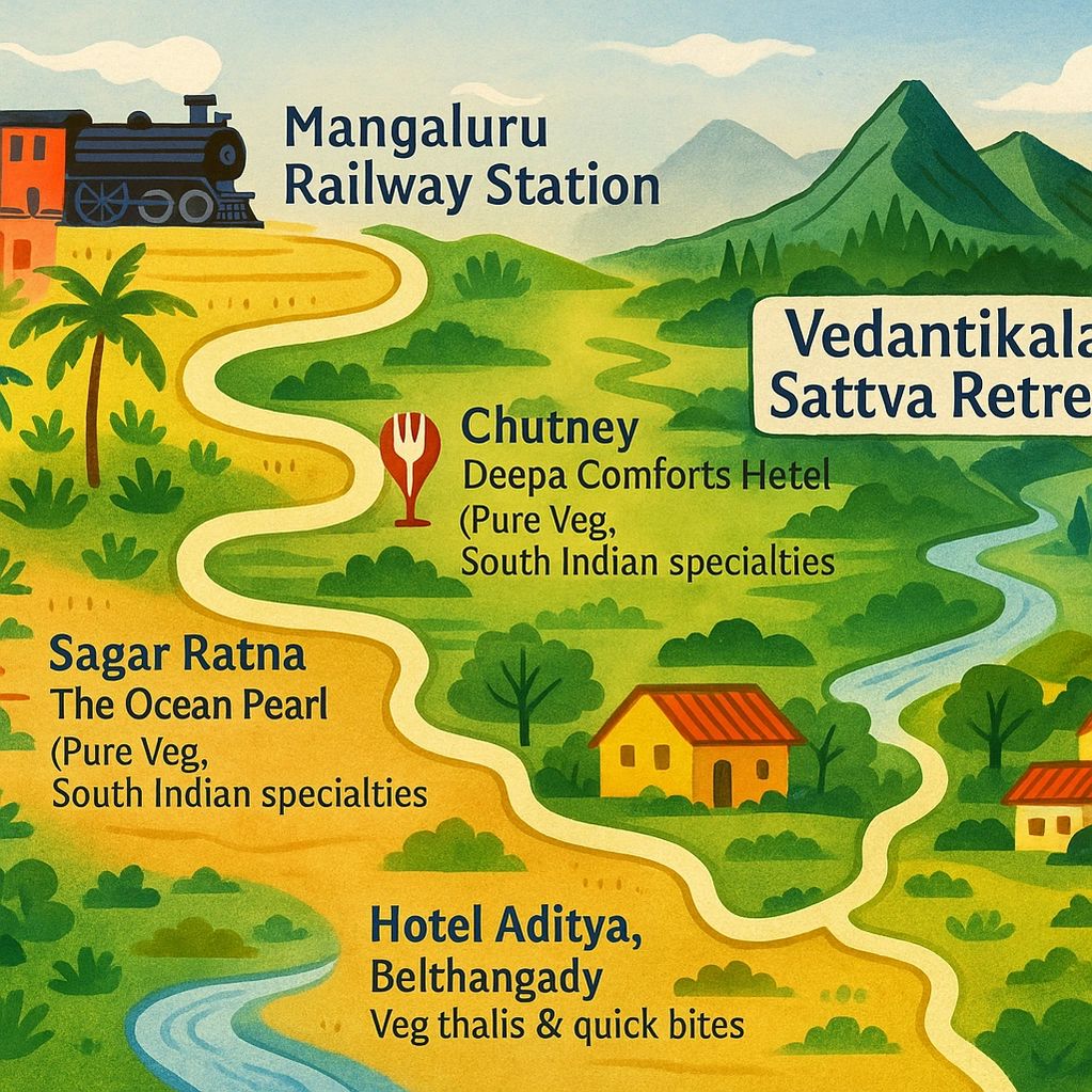 Route: Mangaluru Railway Station → Belthangady → Mudigere → Chikmagaluru → Vedantikala Sattva Retreat