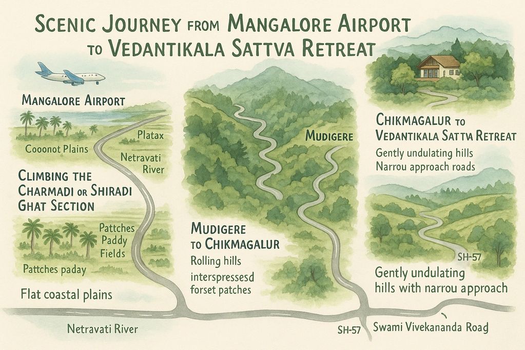 Route: Mangaluru Airport → Belthangady → Mudigere → Chikmagaluru → Vedantikala Sattva Retreat